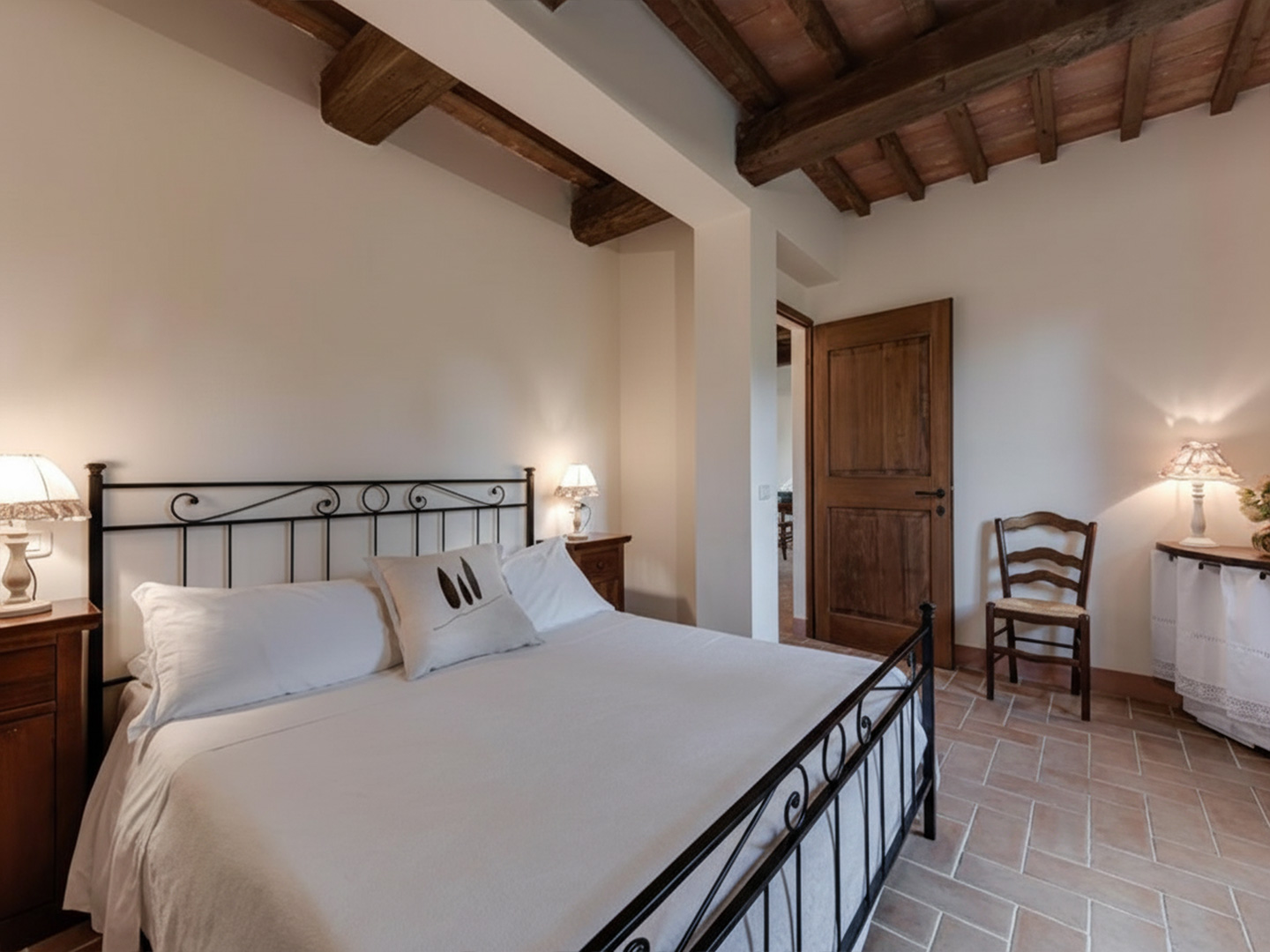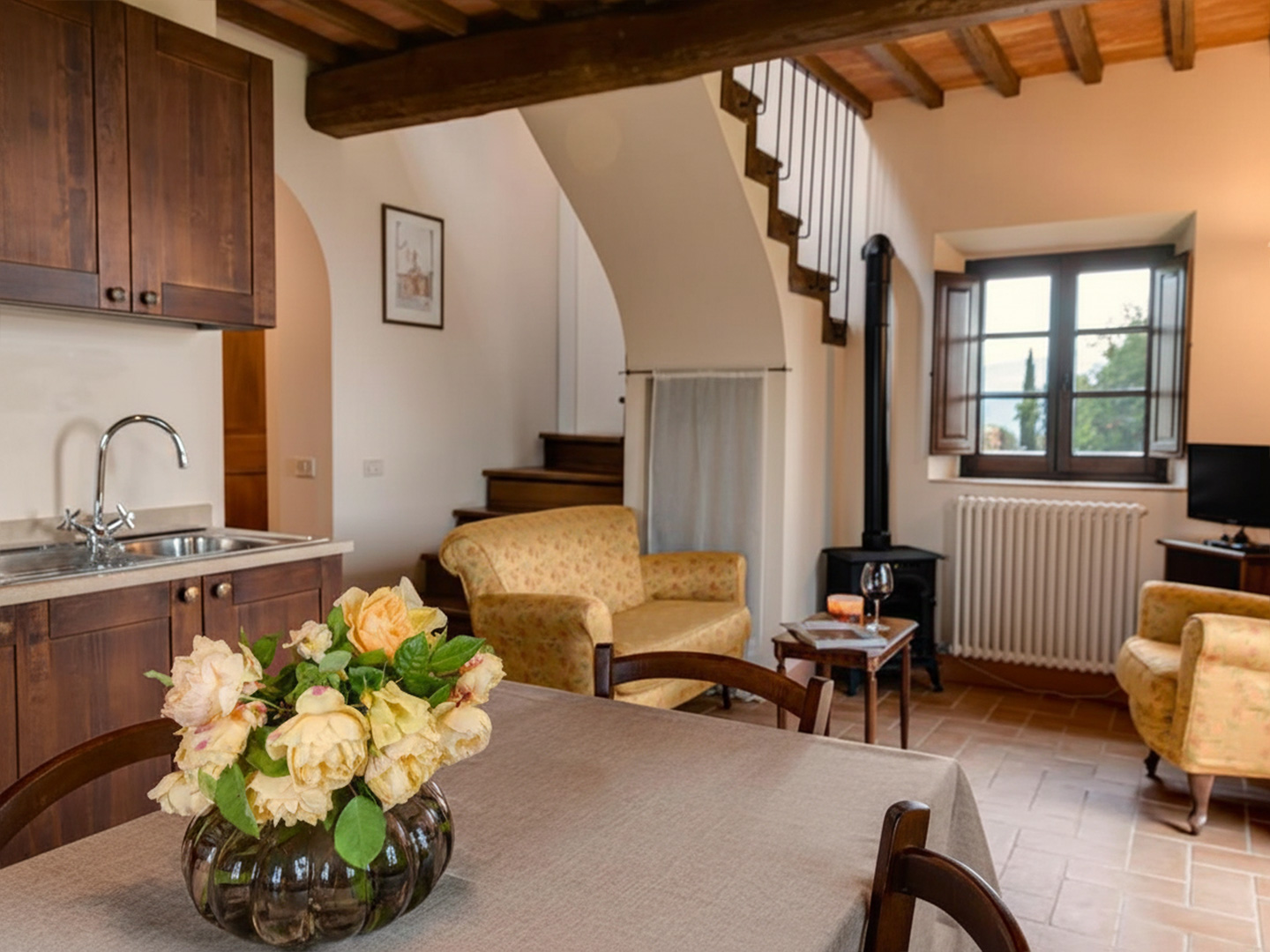 Each apartment features a private terrace overlooking the Brunello vineyards or the rolling hills of the Val d’Orcia.